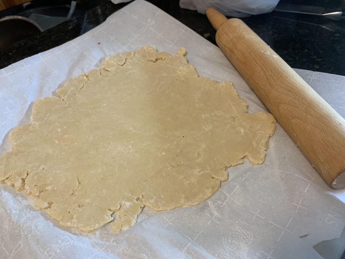 5. Roll the dough into a 12- inch circle and place it on a parchment- lined cookie sheet.