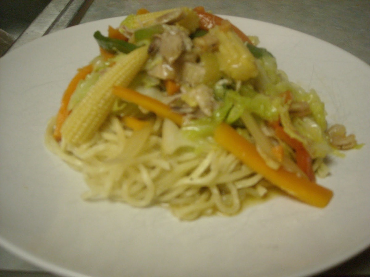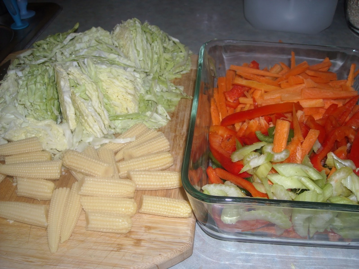 Julienne(cut into matchstick pieces) all the vegetables. In a 14 inch pan, heat 3 TBL of oil and sautee all the vegetables and cornstarch except for the cabbage until tender (not wilted). While the veggies are sauteing, take the dried noodles and boil them in the poaching liquid for about 3-4 minutes. This will give the noodles great flavor. Once the noodles have softened, take them out of the poaching liquid (DO NOT DISCARD) and set aside.