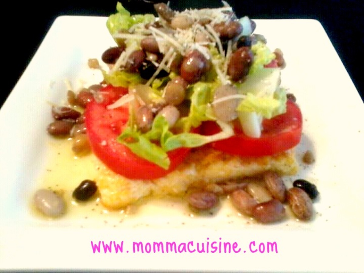 On a serving plate, top the fried polenta with sliced tomatoes, field greens and mixed beans. Garnish with shredded Pamesan cheese. Drizzle with extra virgin olive oil, a squeeze of lemon juice and a small pinch of salt and fresh cracked pepper.