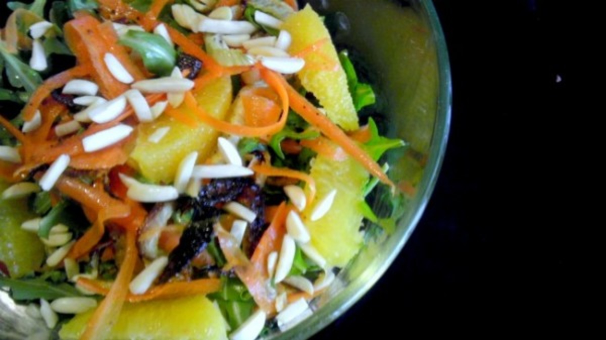 Garnish the salad with fresh orange segments and top with slivered almonds.