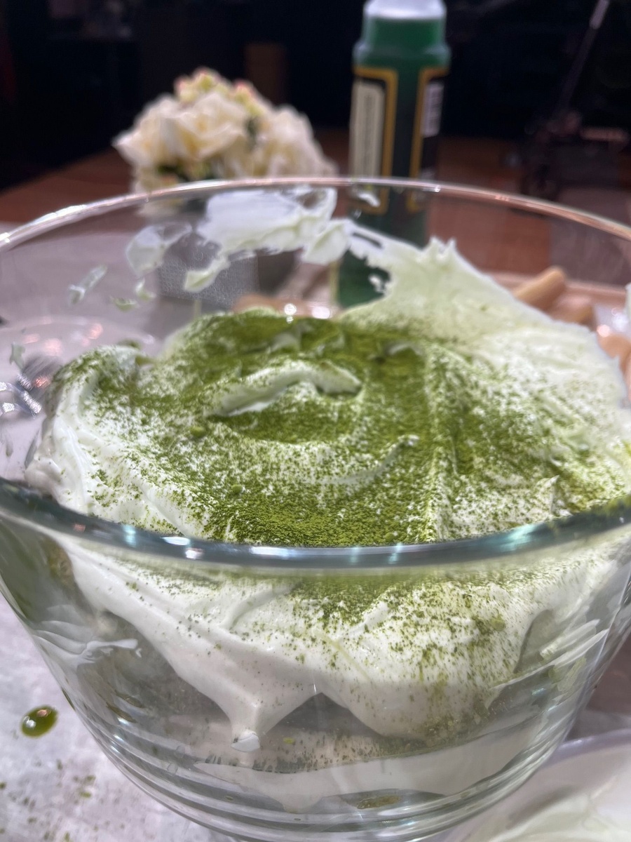 mascarpone cheese, heavy cream, sugar, matcha powder and Pandan Rum until soft