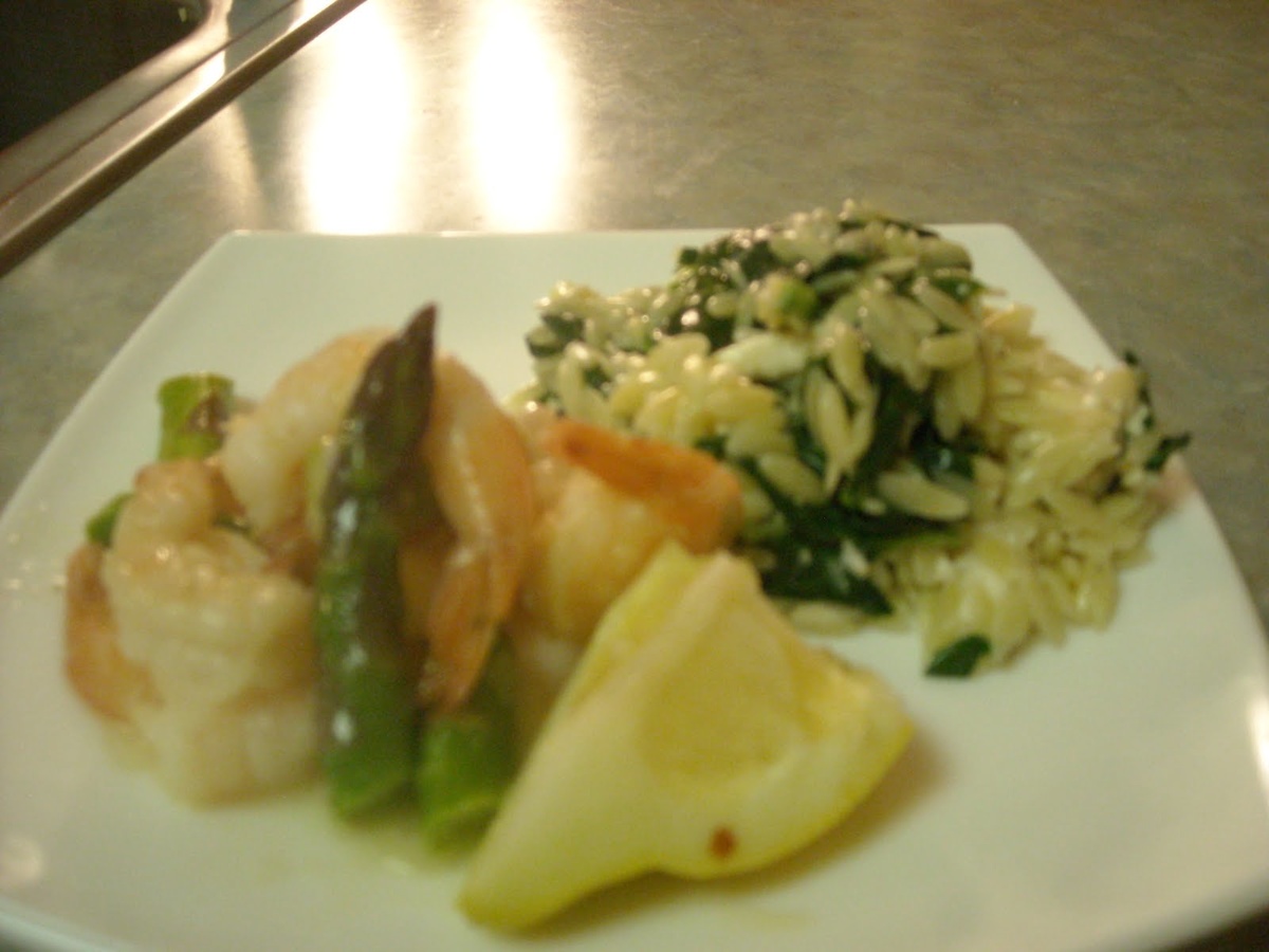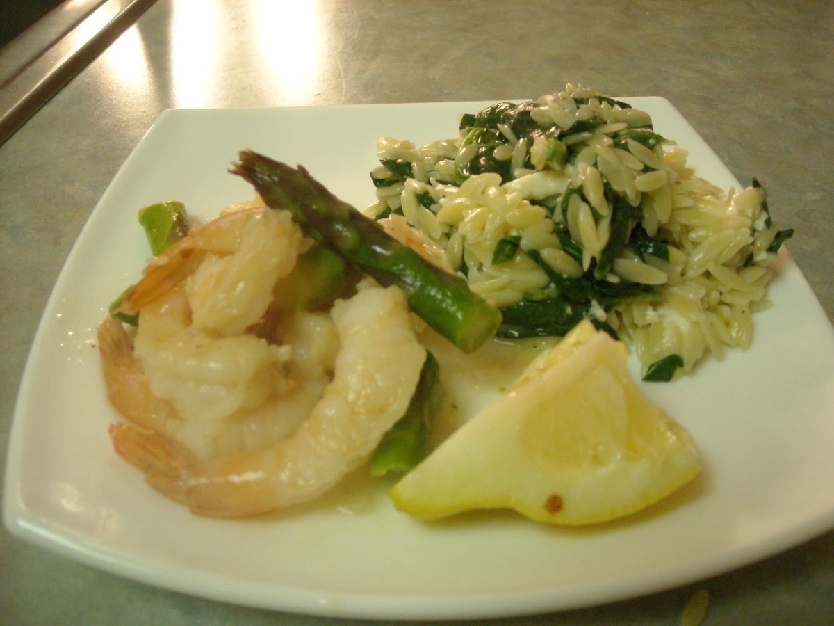 Shrimp & Asparagus in Lemon Garlic Sauce w/ Spinach & Feta Orzo