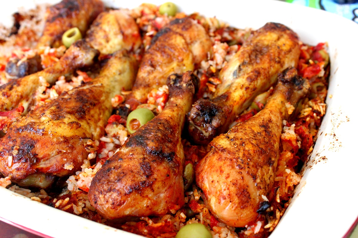 In a large casserole dish, place the uncooked white rice in the bottom and place the browned chicken on top. Simply pour the can of roasted tomatoes on top of the chicken and rice. Then, pour the jar of olives, including the olive juice in with the chicken, rice and tomatoes. DO NOT ADD SALT because the olives are already salty there is no need to add more.