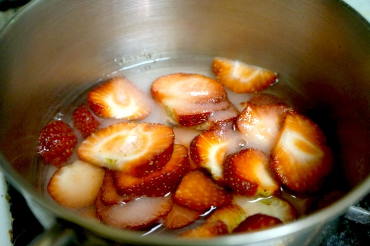Take the strawberries, sugar, vanilla and water and boil together in a sauce pan for about 15 minutes.