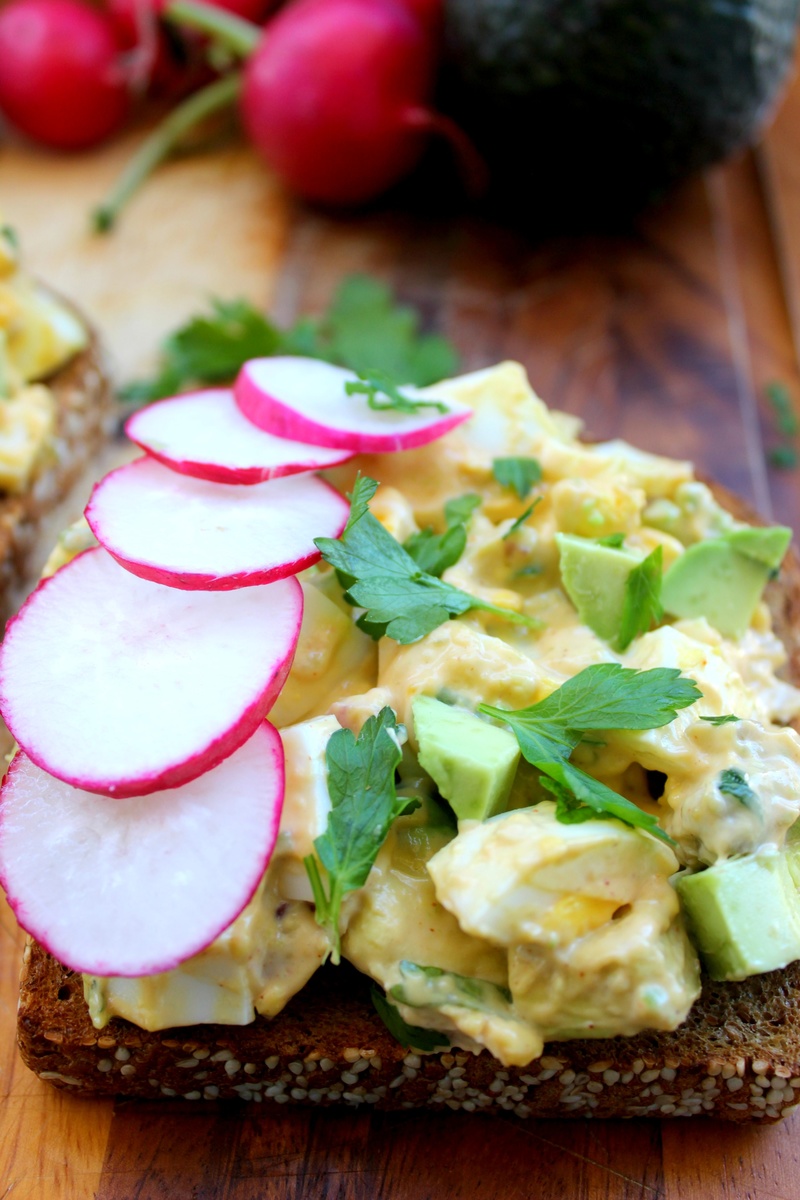Add a heaping scoop of egg and avocado salad. Garnish with sliced radishes and enjoy!