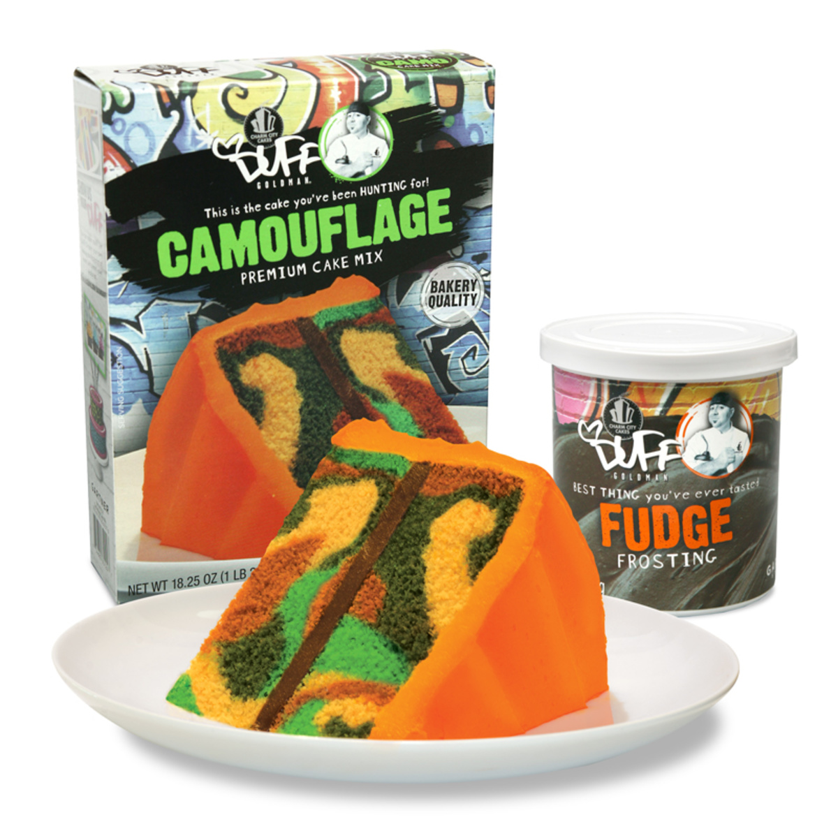 "Duff Goldman by Gartner Studios Camouflage Cake Mix & Fudge Frosting – Hunting for a dessert to make them say WOW? Mix the wild blend of colors in Duff’s new camo cake mix with your personal touches to create a one-of-a-kind patterned cake that stands apart from the pack! Duff Goldman by Gartner Studios’ Premium Cake Mixes use low protein, low gluten flour, which makes for a lighter, fluffier cake. Available at Walmart stores, and at www.duff.com. Perfectly paired with the most delicious, easily spreadable fudge frosting available, from the Duff Goldman by Gartner Studios collection. Available at select Target stores, select Safeway Stores, and www.duff.com