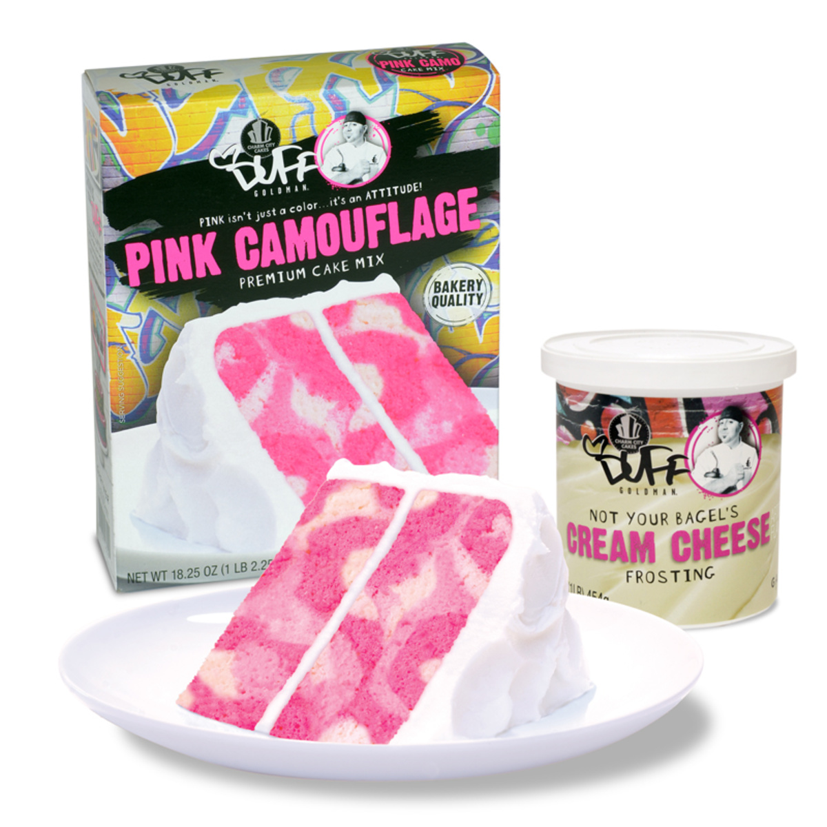 "Duff Goldman by Gartner Studios Pink Camouflage Cake Mix & Cream Cheese Frosting – Who says camouflage is just for guys? Impress your gal pals with Duff’s NEW multi-hue Pink Camo Cake Mix. Or make this patterned cake for your sweetie and you won’t be able to HIDE your love! This fun, fluffy cake is also perfect for girl’s birthday celebrations, and even pink breast cancer events. Available at Walmart stores, and at www.duff.com. Amazing when topped with “Not Your Bagel’s Cream Cheese frosting, Duff’s delicious take on a classic favorite will have you spreading it on everything. Available at select Walmart and Safeway stores, and at www.duff.com