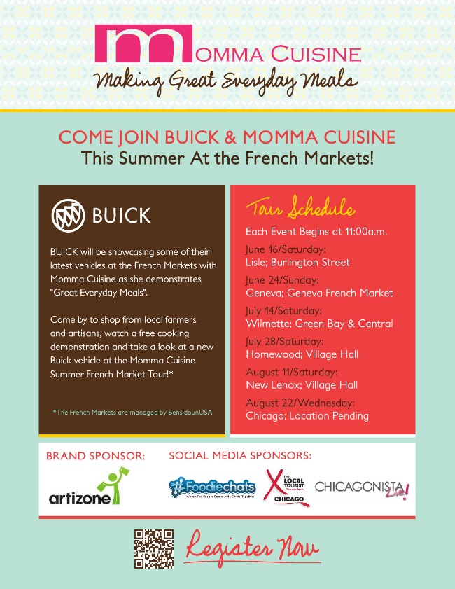 With Buick in tow, each location where I will doing a cooking demonstration, Buick will present a new vehicle where market-goers can look, touch, feel, and sit in the car. As a Buick owner myself, (my husband drives a Rendezvous), it’s a perfect partnership where their vehicles are family friendly, stylish yet still budget conscious.