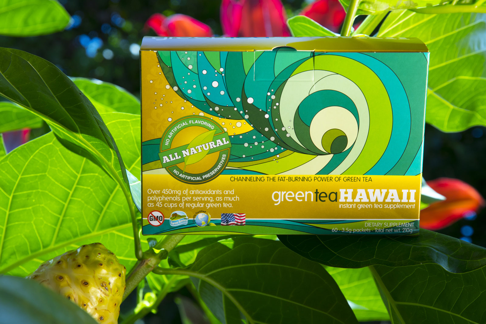 These are all natural, non GMO ingredients with only 10 calories, 2 carbs and loads of antioxidants from green tea and the mystical Noni Fruit plus we added a natural mood enhancer from green tea. We package in single serving sachets that you simply add to hot or cold water. Great for on the go with over 200 health benefits.