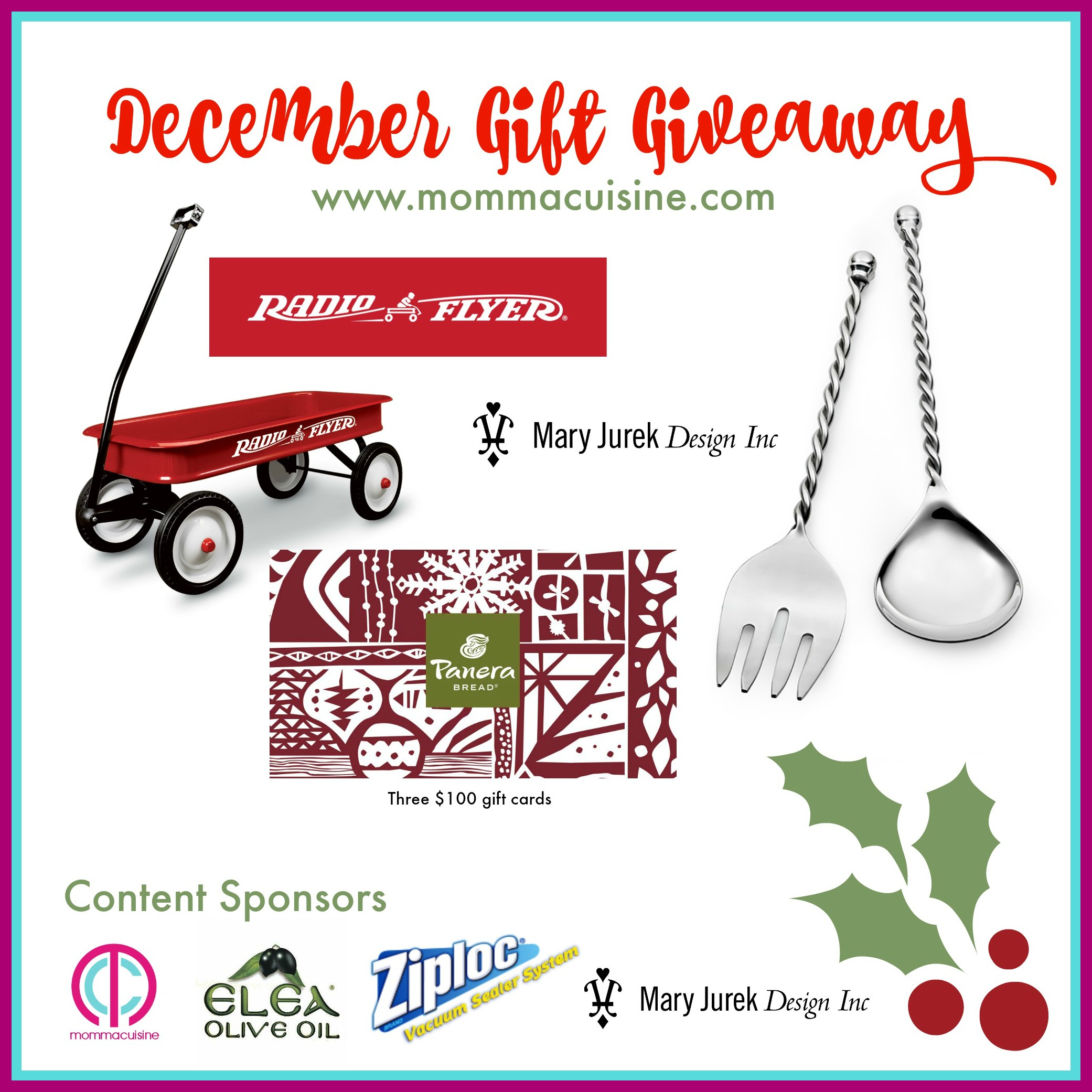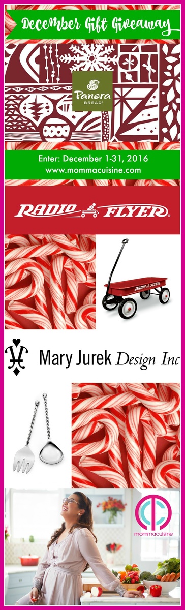I love gifts! In the spirit of giving this Christmas, Momma Cuisine has teamed up with some of the my favorite brands. I am giving away three $100 Panera Bread gift cards, a classic Radio Flyer Wagon and a beautiful Paloma Salad utensil set from Mary Jurek Design.