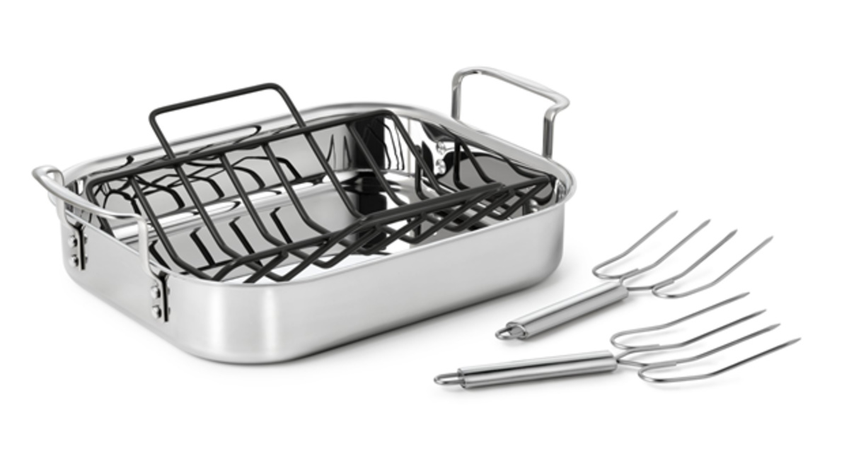The nonstick v-shaped roasting rack goes with the pan. If you want to boast a roasted turkey of up to 25 pounds, it will help you do it with the handles of the pan itself being triple-riveted to provide you a secure hold of such weight. You might think that it’s not that cheap for a once-in-a-year adventure with a turkey, but it’s worth every penny if you are ready to spoil those around you with roasted food more often.