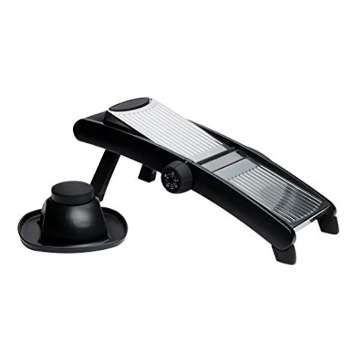 You need to make even, consistent slices? No kitchen tool will serve you better for it than a mandoline. This one can be adjusted for various thickness. Of course, a new cook who’s still not that confident when using a knife will adore it. Moreover, you can play with different kinds of slices: straight, wavy, waffle, or julienne cuts. It will also protect your fingers as it has a special food holder for safety. It is easy to store too because all the blades are attached to the mandoline, whith the food holder keeping them together.