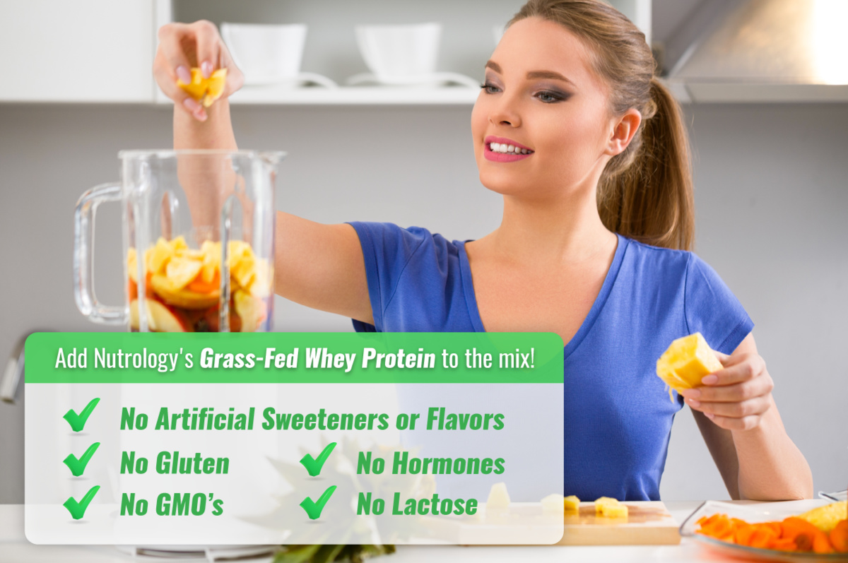 Nutrology's 100% Grass-Fed Whey Protein powder is the best supplement to add to a smoothie, because it is sourced from pasture raised New Zealand A2 cows and is FREE of antibiotics, hormones, GMO's, gluten, lactose, artificial flavors and artificial sweeteners. Additionally, this Grass-Fed Whey is cold-filtered to protect the protein. Healthy ingredients lead to healthy bodies, so it’s important to choose a protein powder that keeps healthy proteins intact.