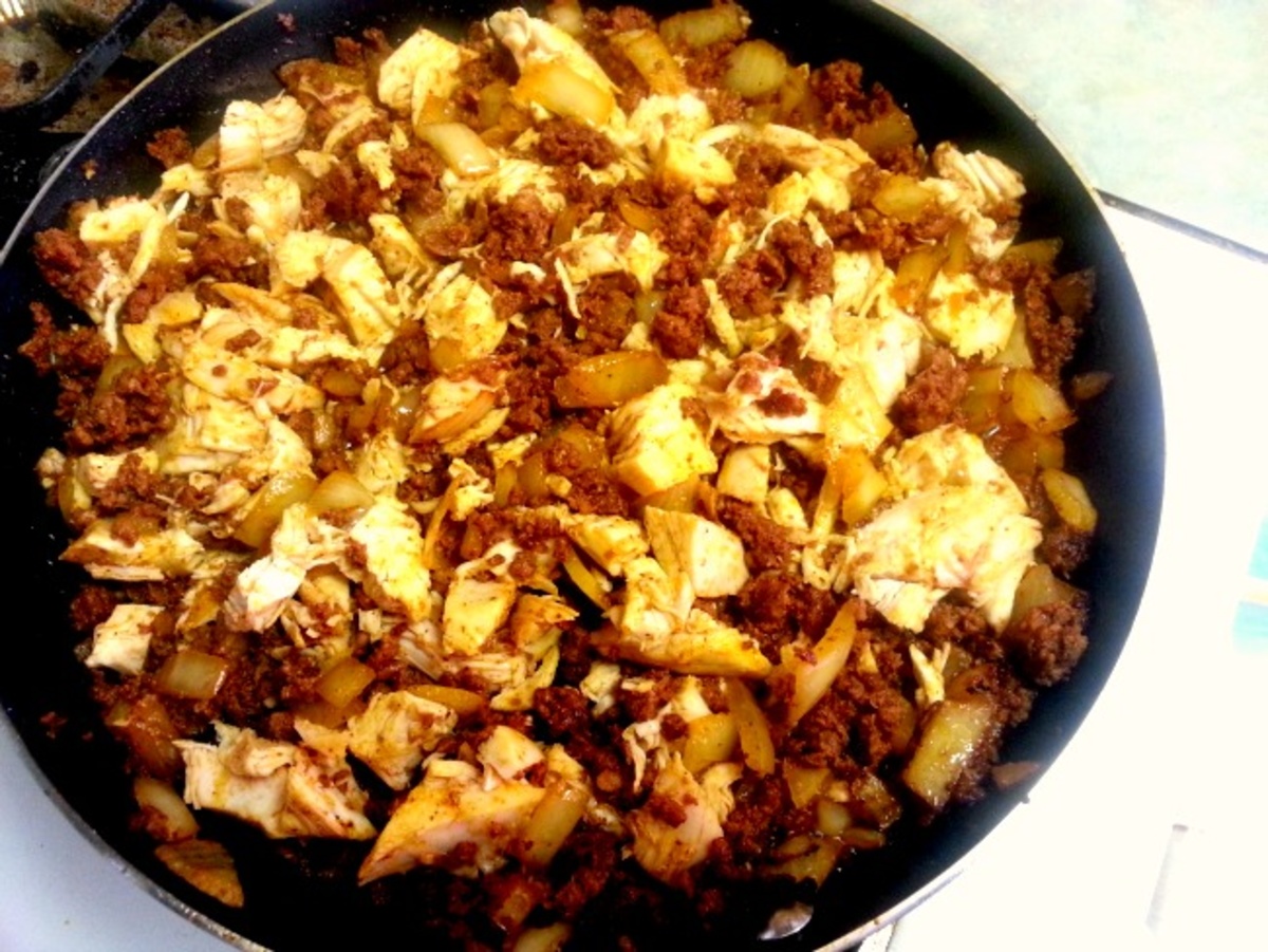 Once the chorizo has fried and oils have come out (about 10 minutes), add the chopped chicken breasts and toss in with the chorizo. Turn the heat off.