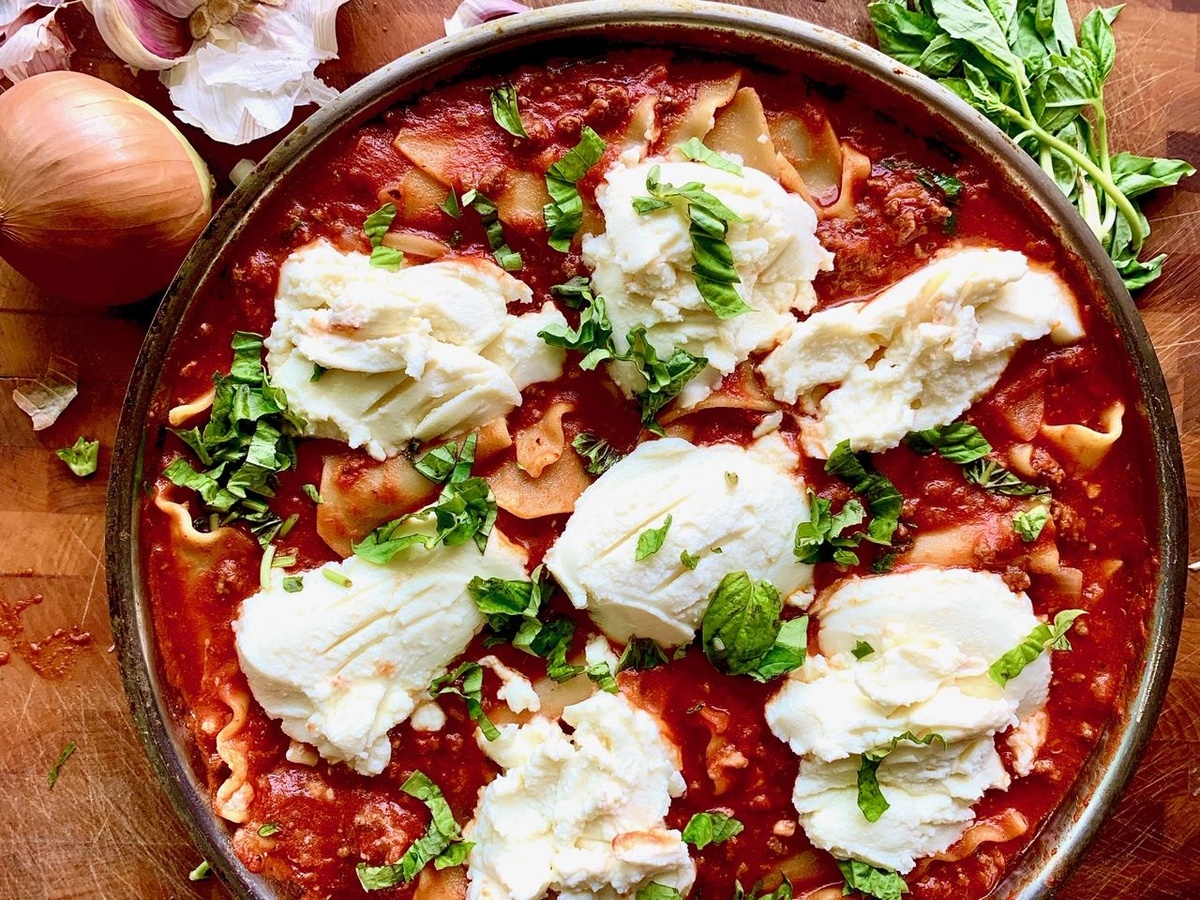 See the full recipe: https://www.mommacuisine.com/recipes/skillet-lasagna